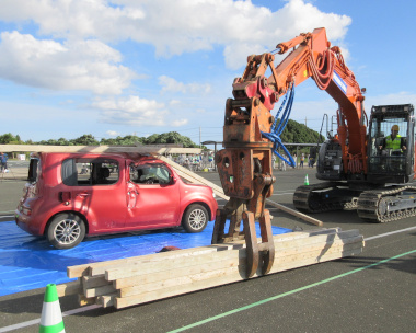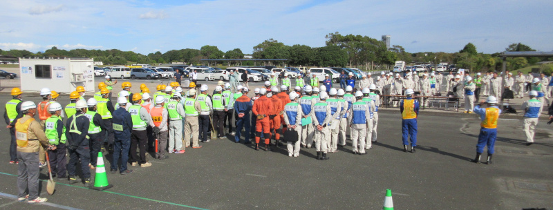 当日は、浜松建設業協会の土木・災害対策委員と、国土交通省浜松河川国道事務所、静岡県西部地域局、浜松市から消防局・土木部、(一社)静岡県西部解体工事業協会など約130名が参加。各機関が連携し、土砂の撤去やがれきの下敷きになった車からの救助作業等、効率的・効果的な手順を確認しながら訓練を行いました。
