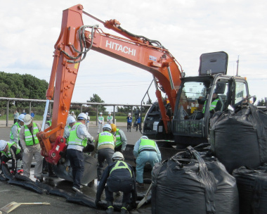 当日は、浜松建設業協会の土木・災害対策委員と、国土交通省浜松河川国道事務所、静岡県西部地域局、浜松市から消防局・土木部、(一社)静岡県西部解体工事業協会など約130名が参加。各機関が連携し、土砂の撤去やがれきの下敷きになった車からの救助作業等、効率的・効果的な手順を確認しながら訓練を行いました。